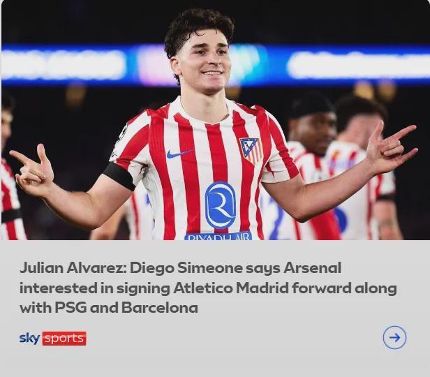 西蒙尼承认阿森纳有意阿尔瓦雷斯!枪手今夏需出售球星回血!